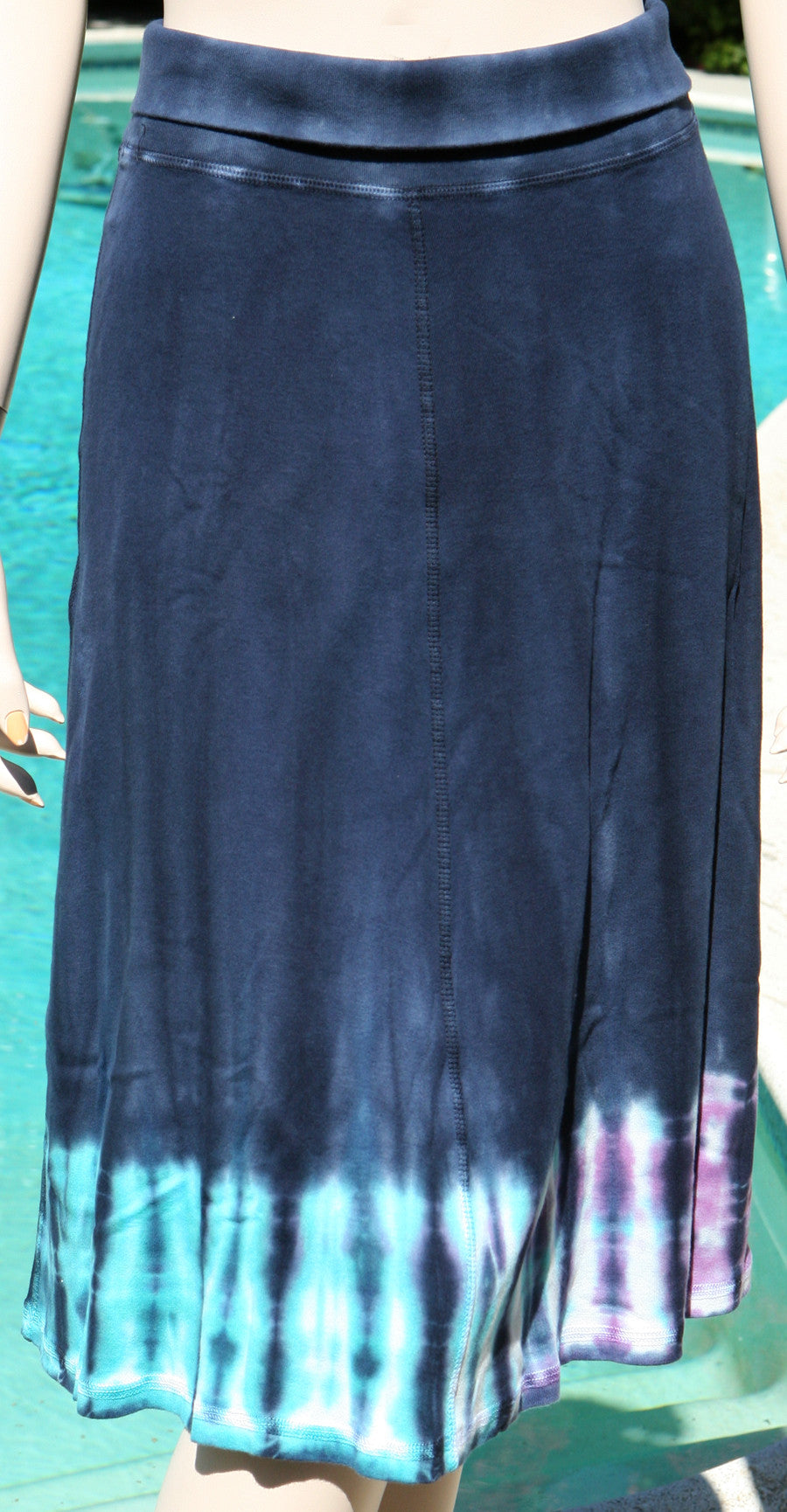 • Mid Length Skirt• Fold-over waist• Artistic river wash with border in dark navy combo• 100% Cotton (1x1 Rib)• Made In USA