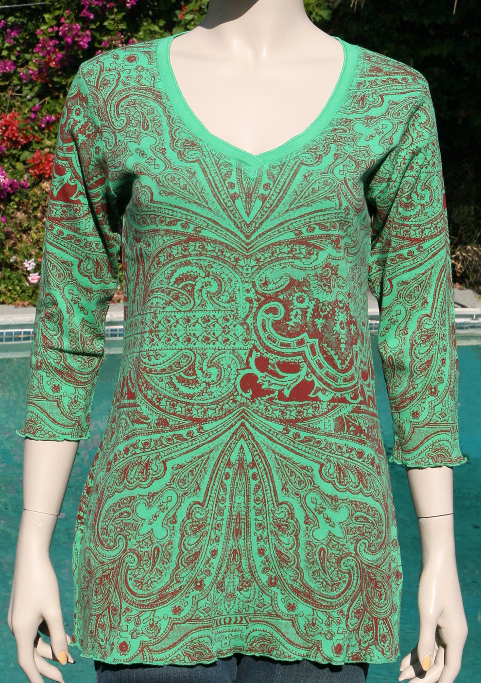 • Deep V-Neck tunic in Red/Green                                        with fine stitched edges at bottom and cuffs