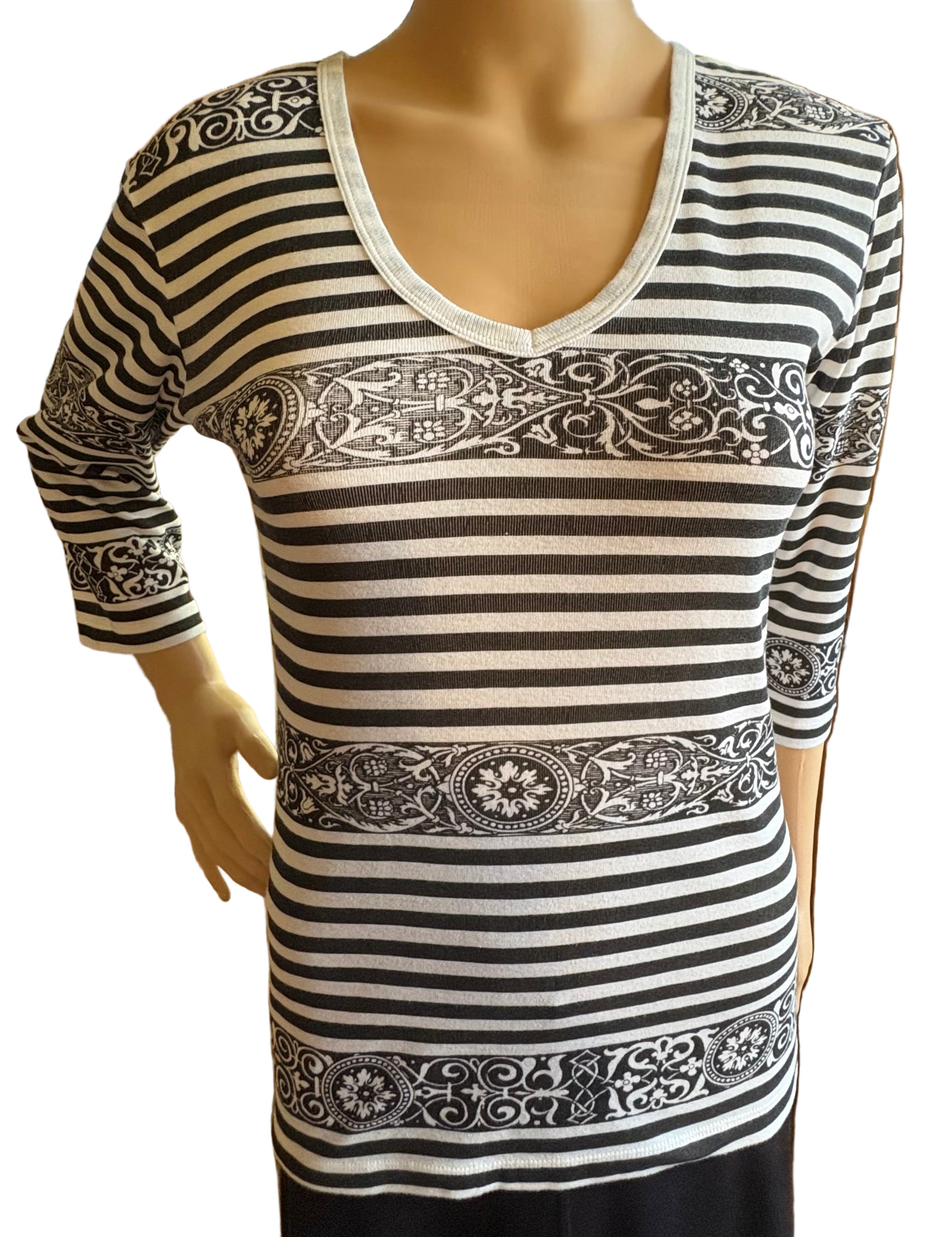 • 3/4 sleeves• V-Neck• Artistic print Black/White• 100% Cotton (1x1 Rib)• Imported