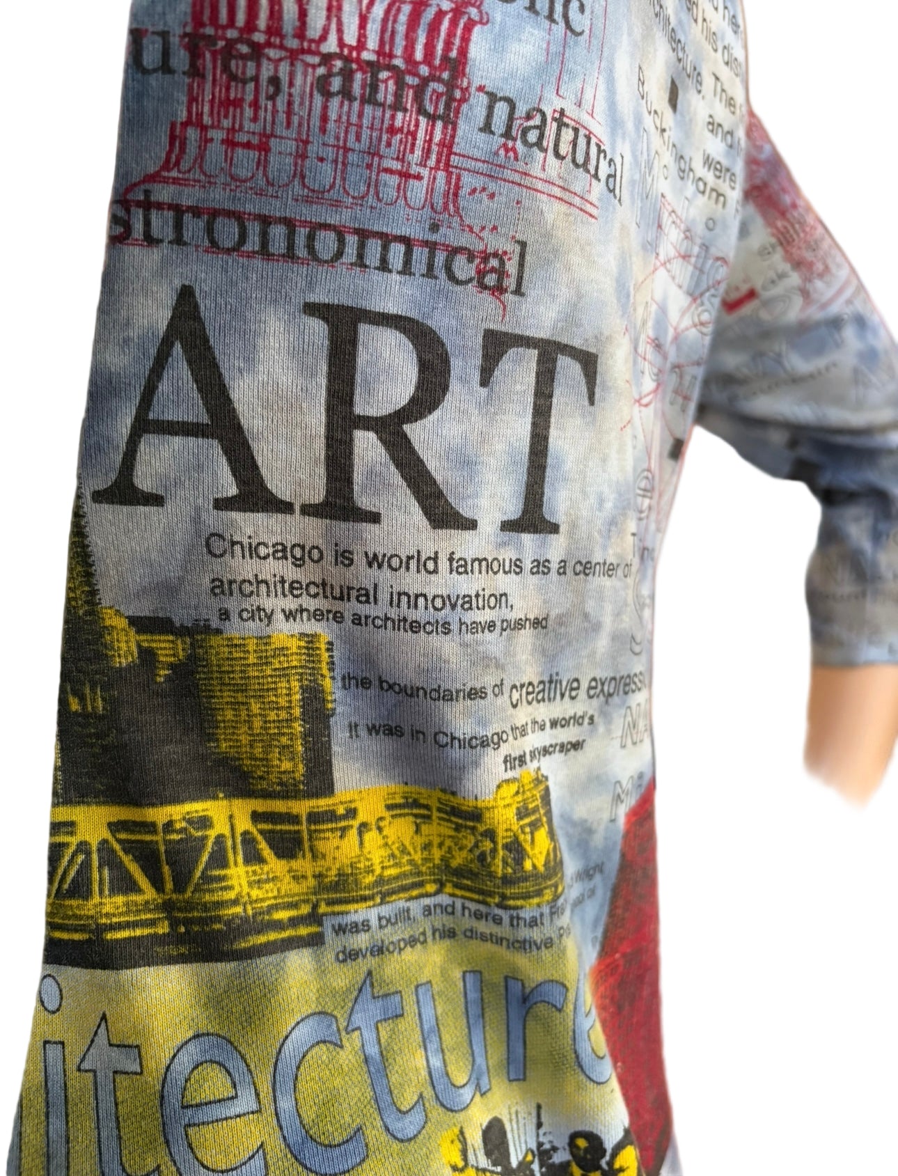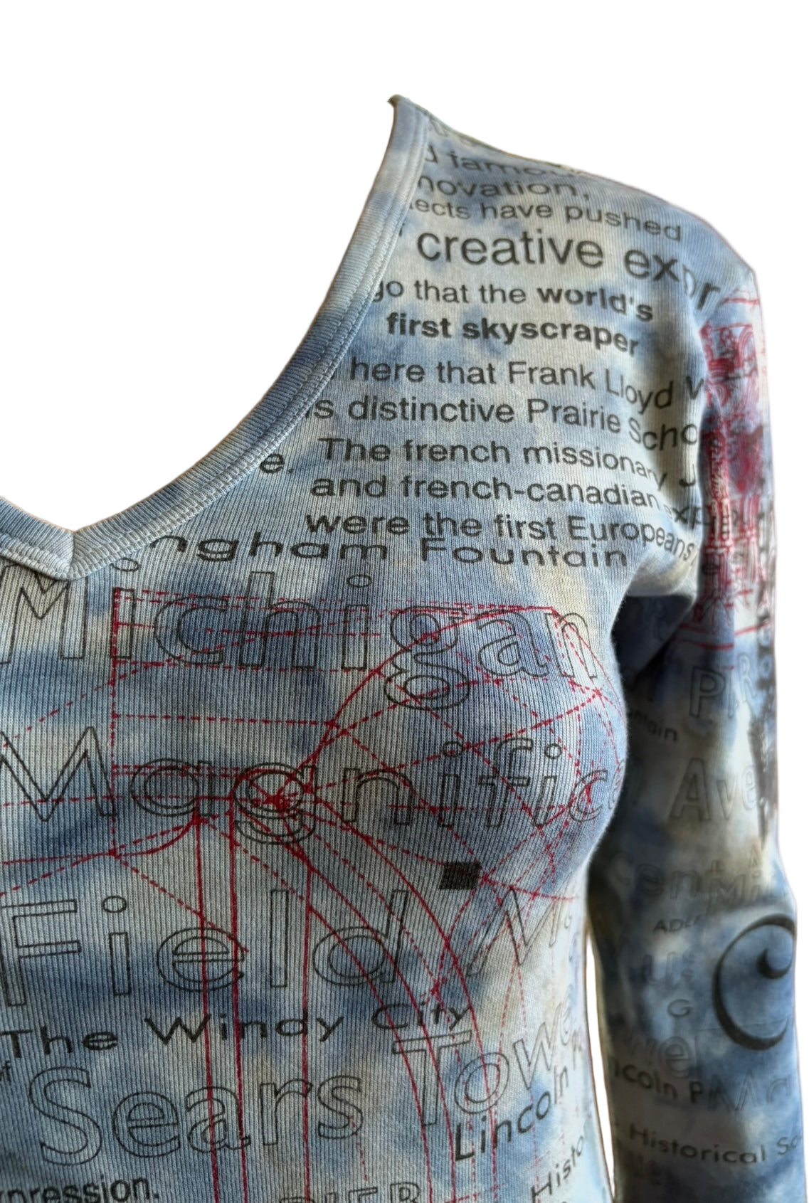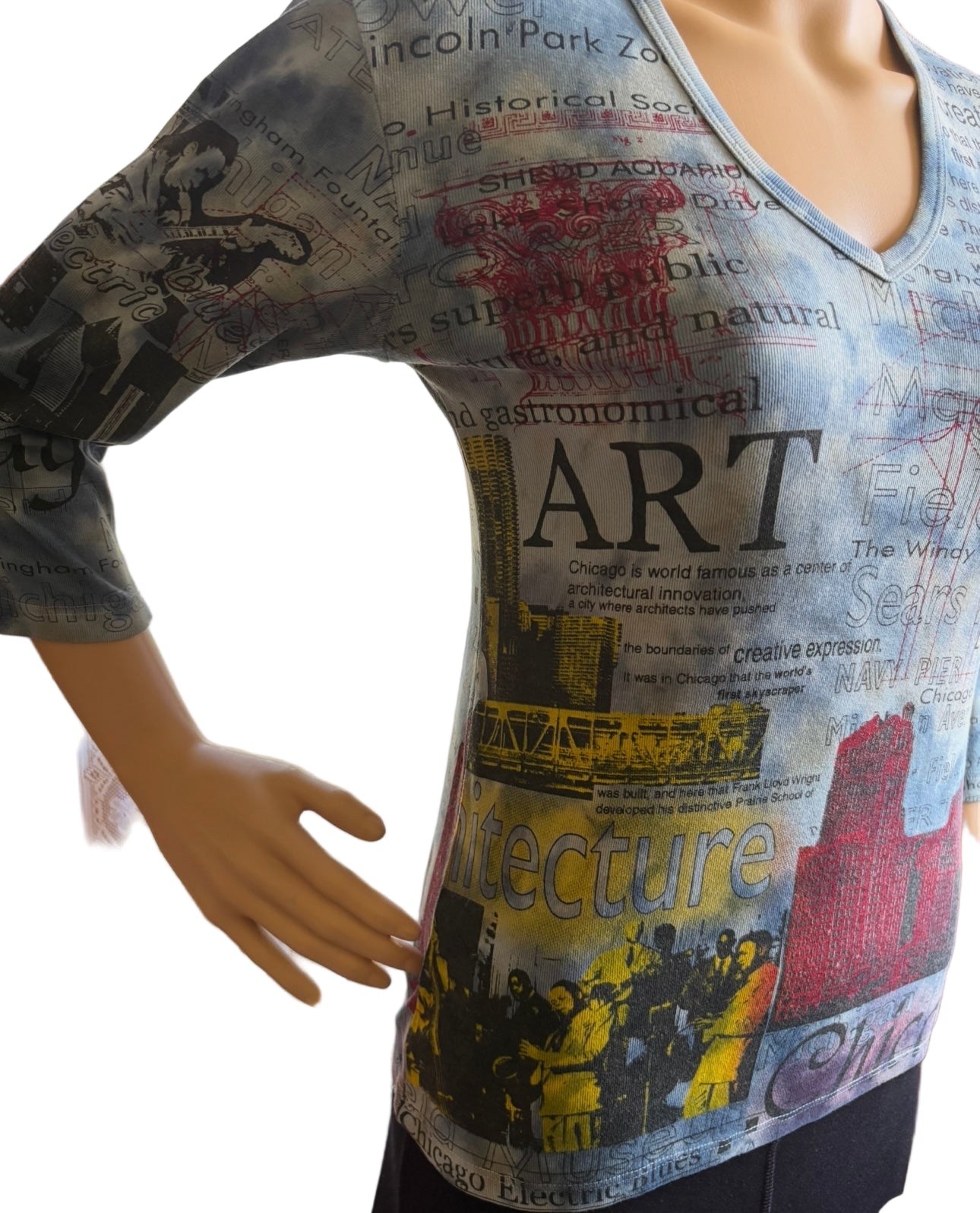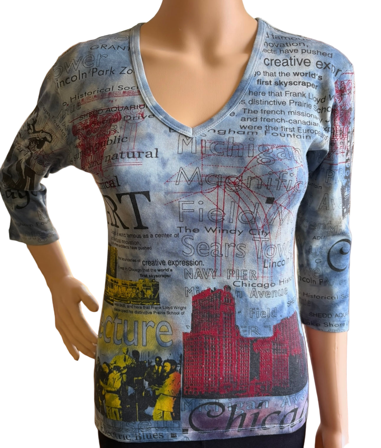 • Chicago Architecture 3/4 sleeve• V-neck• printed top in blue • 100% Cotton (1x1 Rib)• Made in USA