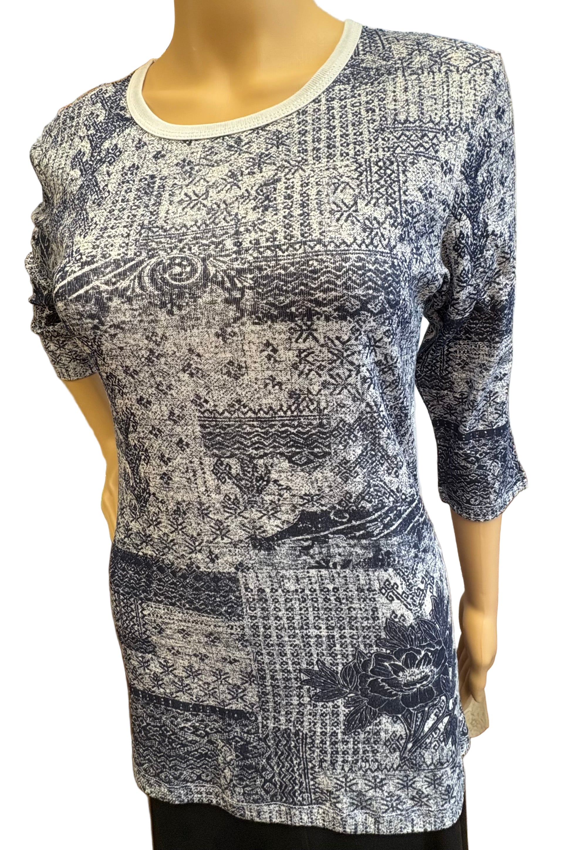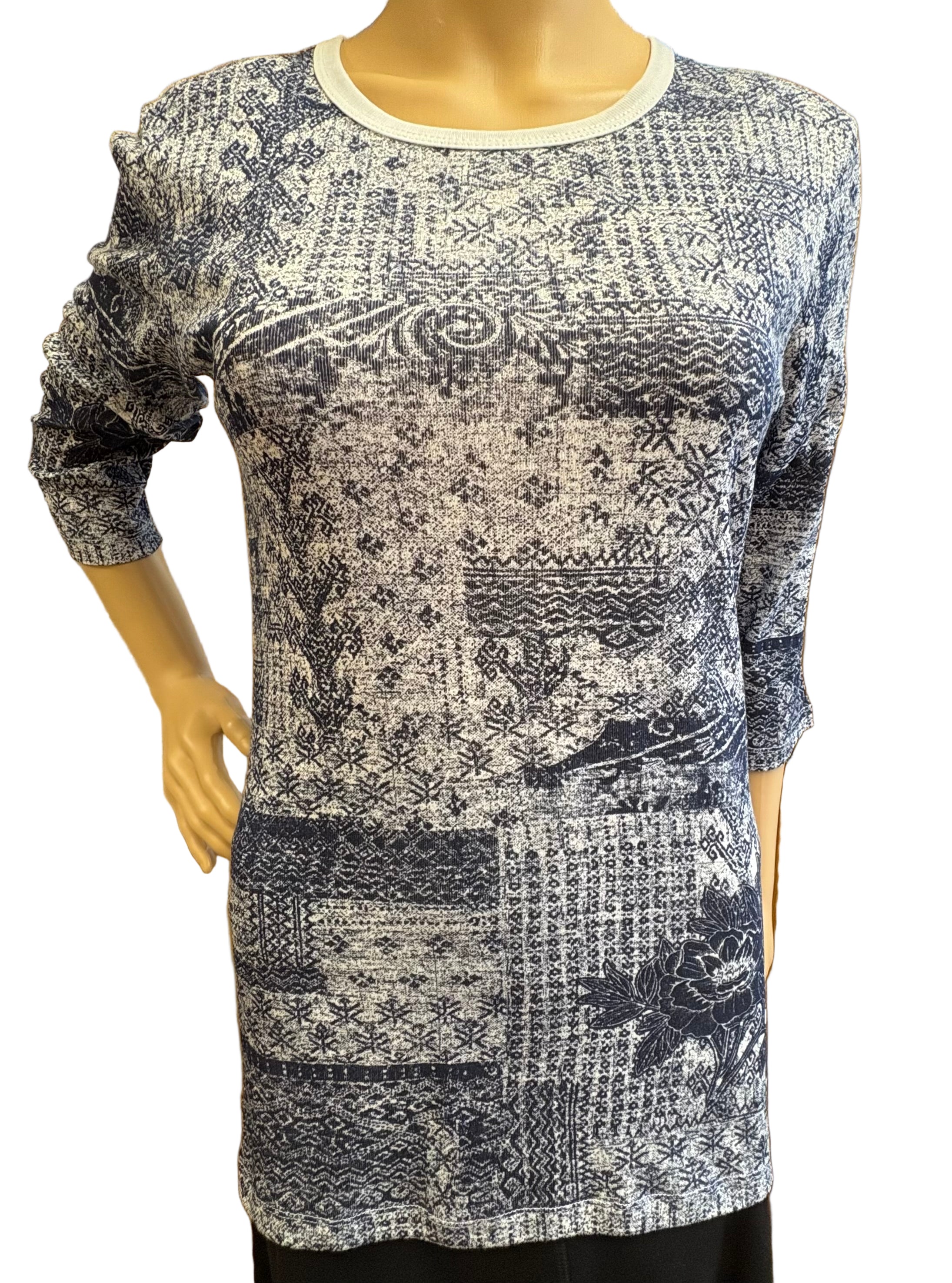 • 3/4 sleeves• Crew neck top• Artistic print in Indigo/White• 100% Cotton (Rib 1X1)• Imported
